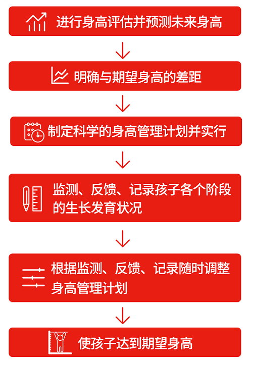 從微觀(guān)的層面講,科學(xué)的身高管理就是在遺的基礎(chǔ)上,利用科學(xué)手段預(yù)測(cè)孩子的最終身高然后對(duì)其身高變化進(jìn)行實(shí)時(shí)的監(jiān)測(cè)、反饋和錄,從而有針對(duì)性地在營(yíng)養(yǎng)、運(yùn)動(dòng)、睡眠、情緒和內(nèi)分泌等方面做出相應(yīng)的管理計(jì)劃,以此來(lái)供進(jìn)孩子的生長(zhǎng)發(fā)育。通常,科學(xué)的身高管理可以分為6個(gè)步驟: